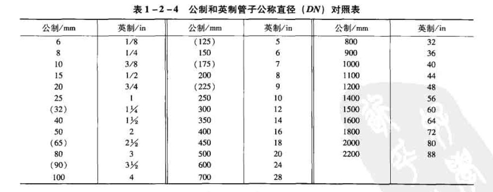 公稱直徑有公制(SI)和英制兩種。在兩種制度中的無縫鋼管具體尺寸和相應(yīng)的螺紋尺寸是一致的。公制和英制的管子公稱直徑對照如表1-2-4所示。